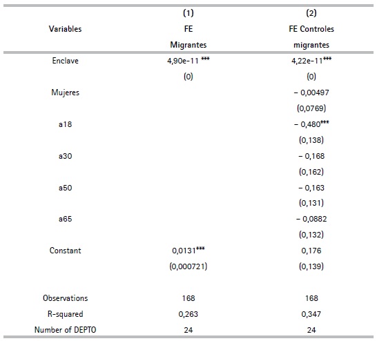 Como se anticipó, existe una potencial autoselección en el modelo presentado pues, si bien la migración tiene vínculo con la productividad, es probable que los migrantes se establezcan en sectores o departamentos en donde haya una mayor productividad para tener más altas probabilidades de ingresos y recursos de subsistencia. Se espera que al considerar los efectos fijos para cada uno de los sectores en cada uno de los departamentos y por tiempo se puedan disminuir los sesgos en los resultados que genera este problema de autoselección15.