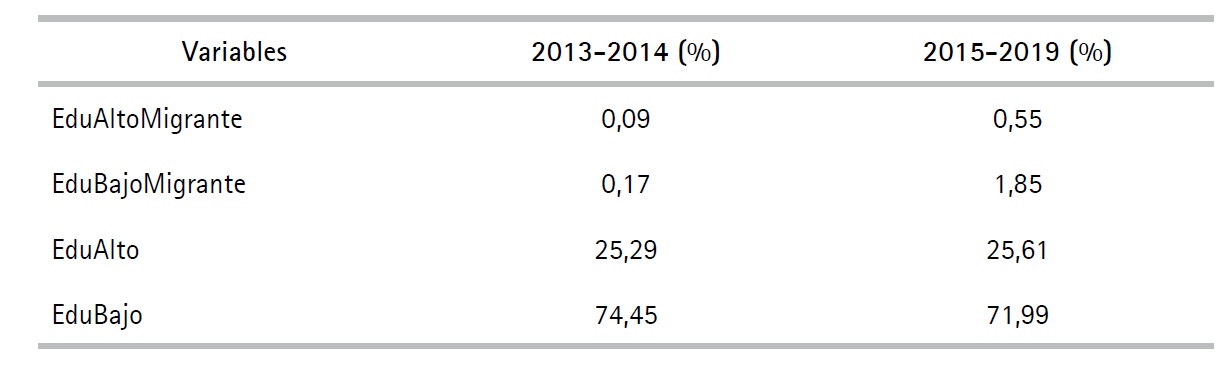 Para el primer periodo 2013-2014 se evidencia en el Cuadro 1, que en promedio el grupo migratorio que tuvo una mayor representación, 0,17 % de la población ocupada, fue el de los migrantes de nivel educativo bajo. Para el segundo periodo este comportamiento se mantiene, lo cual soporta la hipótesis de que el grueso de la población migrante se encuentra en esta categoría y, por ende, es más probable que llegue a competir con la mano de obra del mismo nivel educativo no migrante. No obstante, se confirma un aumento significativo de los migrantes con alto nivel educativo, en el segundo periodo, los que se esperaría tengan una mayor productividad que responda a este grado de educación.
