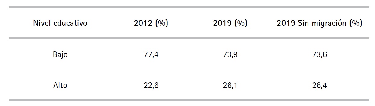 A diciembre de 2019, de acuerdo con la GEIH, de los 22,8 millones de ocupados en el país el 5 % corresponde a migrantes venezolanos, de estos 1,1 millones de migrantes ocupados el 20,5 % tiene un nivel educativo alto y el 79,5 % restante cuenta con un nivel educativo bajo. Al representar el 5 % de los ocupados en Colombia cabe pensar que este flujo migratorio puede, potencialmente, afectar la composición educativa de la población ocupada en el país de manera permanente. Cabe mencionar que esta recomposición dependerá del nivel educativo promedio de los migrantes, el cual puede modificarse a través del tiempo y puede variar entre los diferentes periodos.
