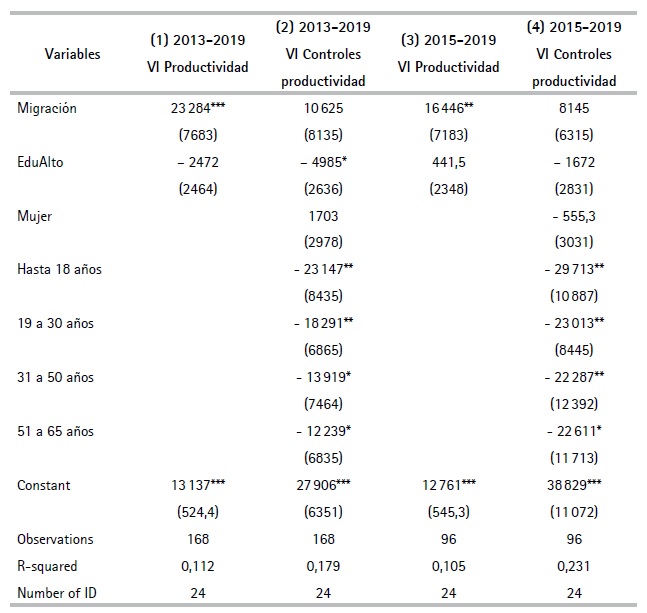 Para corregir la autoselección del modelo estimado en el apartado anterior y encontrar una causalidad directa entre la migración y la productividad, se estima una regresión adicional en dos etapas usando una variable instrumental.