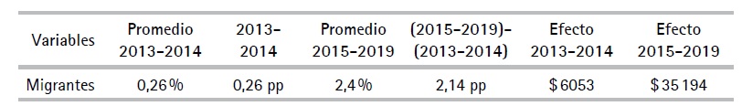 A partir de la metodología antes descrita, se pueden observar los resultados expuestos en el Cuadro 5 para el periodo total evaluado (2013-2019) y para el periodo 2015-2019, corrigiendo la endogeneidad de la migración por medio de la variable instrumental.