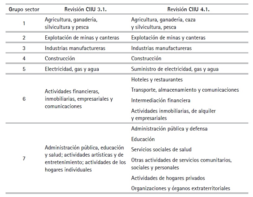 Para realizar esta caracterización de datos se clasificaron los sectores en siete grupos para homologar la información de los sectores establecidos en la GEIH con los de las cuentas por valor agregado. De acuerdo con esta agrupación, enumeramos los sectores de la siguiente manera: 1) Agricultura, ganadería, caza y silvicultura o pesca; 2) Explotación de minas y canteras; 3) Industrias manufactureras; 4) Suministro de electricidad, gas y agua; 5) Construcción; 6) Comercio, hoteles y restaurantes, transporte y almacenamiento, intermediación financiera, actividades inmobiliarias; y 7) Administración pública, educación, servicios sociales y salud, actividades de hogares privados, organizaciones y órganos extraterritoriales, otras actividades de servicios comunitarios. Esta categorización se utilizará en adelante para hacer referencia a los grupos de sectores productivos estudiados (véase en anexo A6 estadísticas descriptivas).