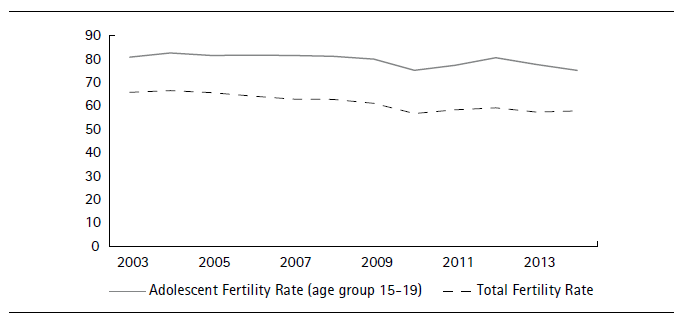 During the second half of the 20th century, Colombia experienced an important demographic change. The female fertility rate fell from 6.7 children per woman in 1969 to 3.3 in 1986 and 2.6 in 2000 (Flórez, 2005). Figure 1 shows the evolution of Total Fertility Rate (TFR) and the Adolescent Fertility Rate (AFR) for women aged 15-19 years, with a steady decline of the TFR during the whole period. Meanwhile, despite decreasing overall the AFR exhibits greater fluctuations and oscillates in the same high levels. For instance, it remained almost constant from 2003 to 2009, while it grew significantly during the 2010-2012 period.