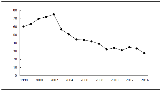 Recently in Colombia there have been two periods of high levels of violent crime. The first goes from the 1980s to the year 1991; this period corresponds to an increase in drug trafficking and the consolidation of the Medellin and Cali cartels. The second, from 1997 to 2002, coincides with the reinforcement of illegal armed groups such as Paramilitaries, ELN, and FARC (Sánchez et al., 2003). Despite the decrease in the homicide rate during the last decade, rates for Colombia remain among the highest in the world and are the second in Latin America after Venezuela’s. Figure 2 shows the evolution of the homicide rate in Colombia from 1998 to 2014.