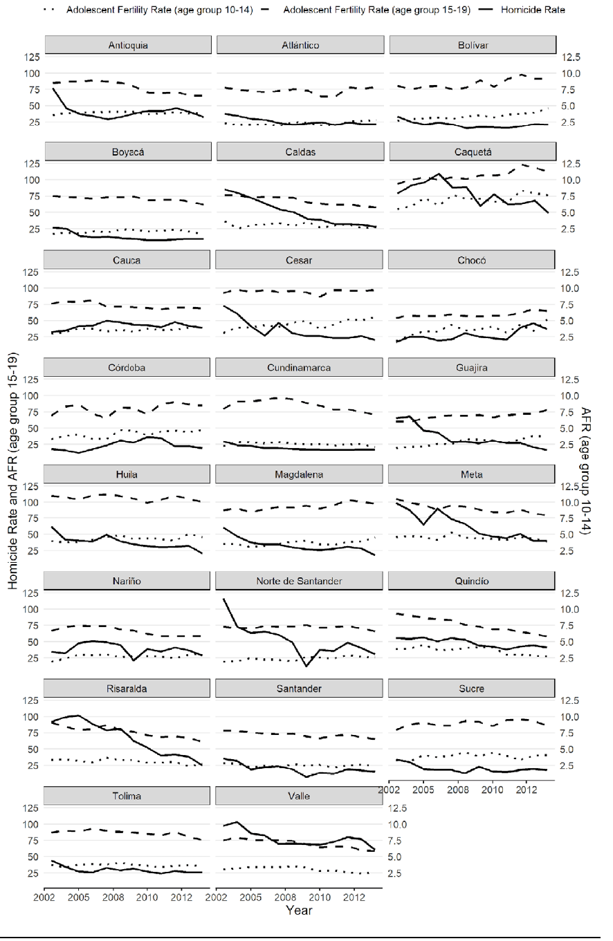 Source: Authors based on DIJIN and DANE data.In this figure, we see that AFR for the 10-14 age group remains considerably lower than the AFR for the 15-19 age group; nevertheless, all departments exhibit a constant or increasing rate. On the other hand, AFR for the 15-19 age group and homicide rates follow a decreasing trend during the period, for most of the departments.