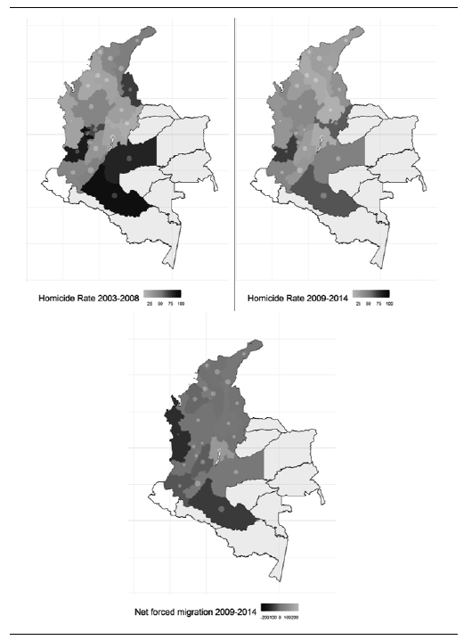 On average, the homicide rate is 39.13 homicides per 100.000 inhabitants. The highest homicide rate was registered by the Norte de Santander department, with 115 homicides per 100.000 inhabitants in 2003. The lowest figure was reached in the Santander department in 2009 with 7.45. Finally, on average, the net migration due to forced displacement is -6.36 individuals per 10.000 inhabitants. The department with the highest population outflow in 2006 was Caquetá, with a net migration of -313.29 per 10.000 inhabitants. The department with the highest inflow of individuals is Cundinamarca, which received 289.94 individuals per 10.000 inhabitants in 2007. Figure 4 shows that, not surprisingly, departments with the highest homicide rates also exhibit the highest outflow of individuals. Furthermore, some of those departments also show higher AFR.