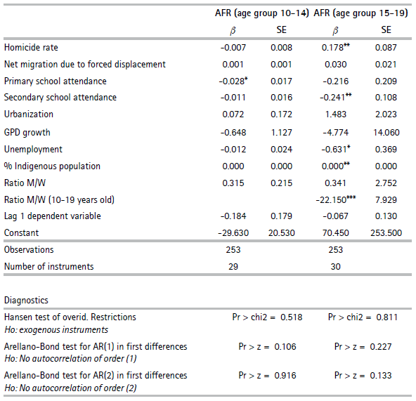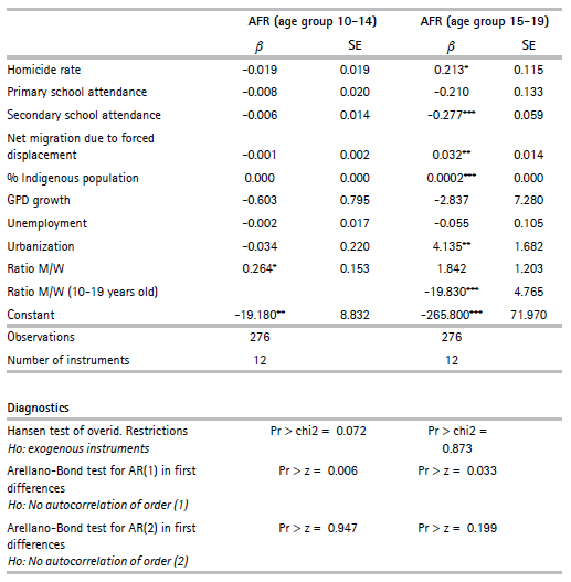 The models seem to provide empirical evidence that, to some extent, supports the hypothesis that the homicide rate has a positive effect on adolescent fertility for the 15-19 age group; however, this result is statistically significant at 10%. Once the endogeneity of the homicide rate is controlled, the output suggests that the AFR for the 15-19 age group increases by 213 births per 1000 women when the total number of homicides increases by 1000 deaths per 100.000 inhabitants.