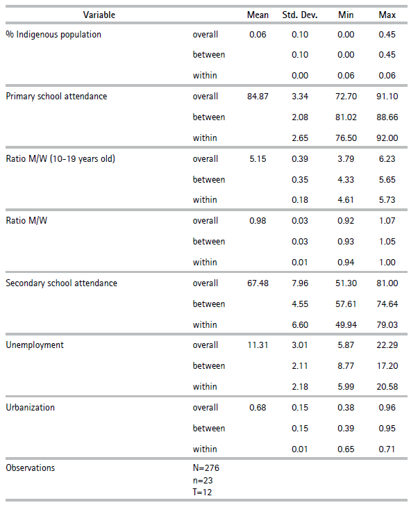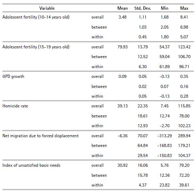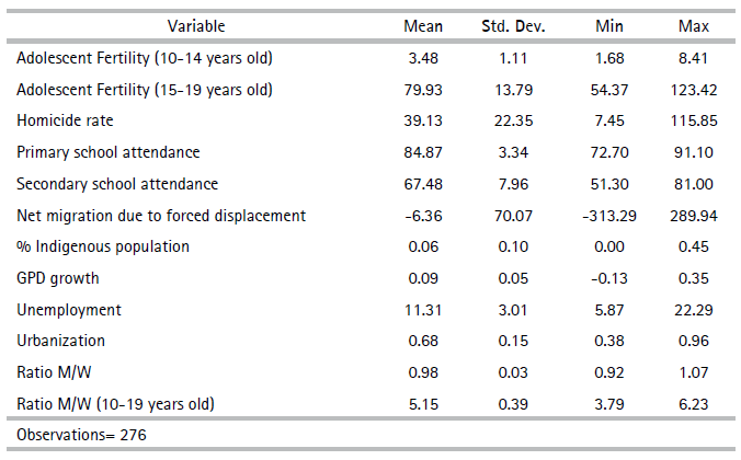 Information about the indigenous population and migration due to violence capture societal elements affecting fertility decisions that are specific to these contexts. The indigenous population was included for two reasons. First, because demographic statistics suggest that the overall fertility rate is higher in ethnic populations, meaning that the adolescent fertility rate among these communities may also be higher. Second, the indigenous and Afro-descendant communities have been repeatedly affected by the internal conflict, which implies, among other things, greater socioeconomic difficulties.