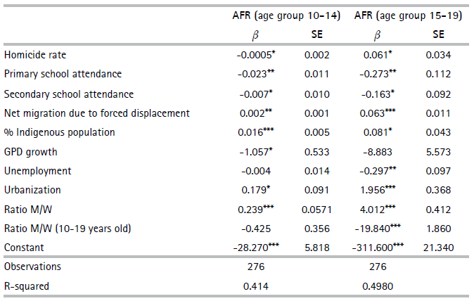 By using an aggregate database, in this case by department, the results obtained could be capturing other phenomena related to unobservable variables, wrongly interpreting the estimated coefficient. For instance, the availability and access to information on responsible sexual practices, education and health services, represented in our model by the urbanization level, have a positive impact on AFR, which goes against theoretical predictions. To obtain better empirical approximations, following studies should work with databases that cover at least the municipal level or, in better scenarios, the neighborhood level or micro-data on apprehension.