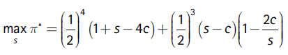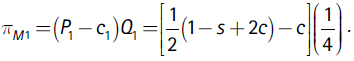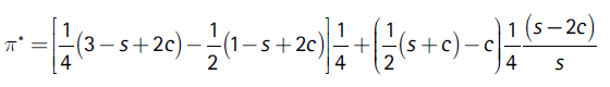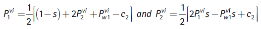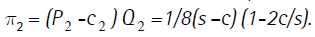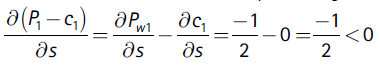 From the values of the wholesale prices shown above, we need to prove the conditions that make it possible to satisfy the following inequality, ½ +c/2>2(1-s+ 3/2 c)/(4-s). Rearranging the latter algebraically, we find that 3s > c(2+s), which in turn is equal to 3s/(2+s) >c. This inequality is the same as the price expression seen above, which is always true, and hence