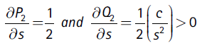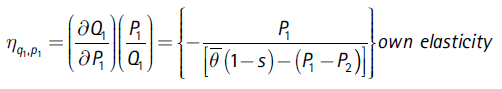 As a result, both own and cross elasticities for products 1 and 2 depend on the same parameters. Their values show that the denominators are the same, and thus the comparison depends only on the values of the numerator. In the case of product 1, own elasticity is always higher than cross elasticity as P1>P2. On the other hand, the own elasticity for demand and the cross elasticity for product 2 depend on the value of s, and thus, if quality s is higher, both elasticities are closer.