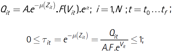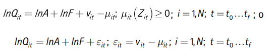 [2]El problema de estimación de la FPS en (2) radica en dos aspectos. Primero, el índice de eficiencia técnica impone la restricción que Segundo, la estimación del error estocástico εit no distingue las estimaciones de los errores νit y μit. Para identificar estos componentes se requiere asumir distribuciones específicas para ambos errores y las estimaciones se basan en el método de máxima verosimilitud (MV). Las distribuciones usuales de μit que se asumen para las estimaciones son: i) la mitad de una función normal estándar (usualmente denotada como