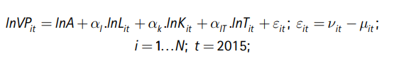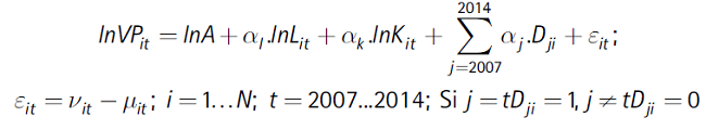 Los métodos de estimación de las funciones de producción estocásticas —FPS—, los índices de eficiencia técnica —IET— a nivel de empresas y los códigos STATA son resumidos en Kumbhakar y Lovell (2000), Kumbhakar, Ray, y Dua (2015), Kumbhakar, Wang, y Horncastle (2015), y Belotti et al., (2012). Estos se basan en la siguiente frontera o función de producción: