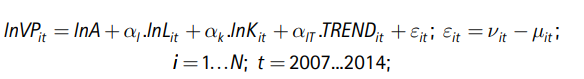 y iii) de los factores de incidencia Zit que determina μit. Estimaciones de los IET basados en la FPS abundan en la literatura de los países desarrollados, en desarrollo y de América Latina entre otros, Ghana (Page, 1980), diversas regiones del mundo (Lee, 2005), Vietnam (Tran et al., 2008), y México (Valderrama et al., 2015).
