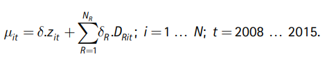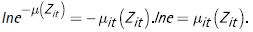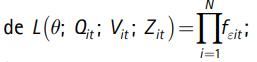 v) La estimación del vector de parámetros θ (que incluye la función de producción, las medias y varianzas de las distribuciones de f ν y fμ', el vector de parámetros δ de la variable μ(Zit), la cual asume que: