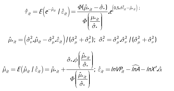 Las fórmulas de cálculo del índice eficiencia técnica depende de: i) las funciones de distribución asumidas de las funciones f ν y fμ; ii) la existencia o no de varianzas heterocedásticas (o distintas por cada observación) de