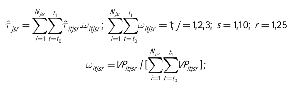 0 (que puede originarse cuando se introduce más variables relevantes y productivas a la FPS o mejores mediciones de los factores de producción) todo el error estocástico de la FPS sería debido a la ineficiencia técnica de la firma. Los promedios ponderados de los IET de la muestra ‘’ (formal, j = 1; informal, j = 2; y total j = 3) de unidades productivas para cada sector ‘s’23 y región ‘r’ son obtenidos de la siguiente fórmula: