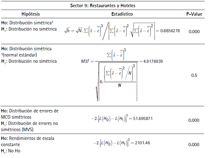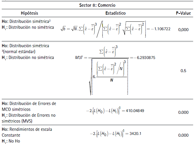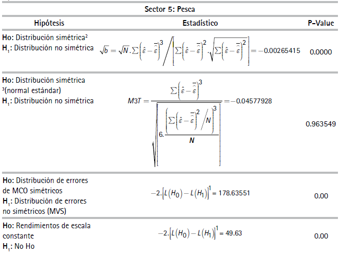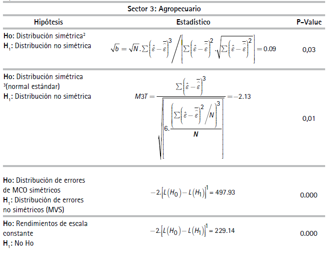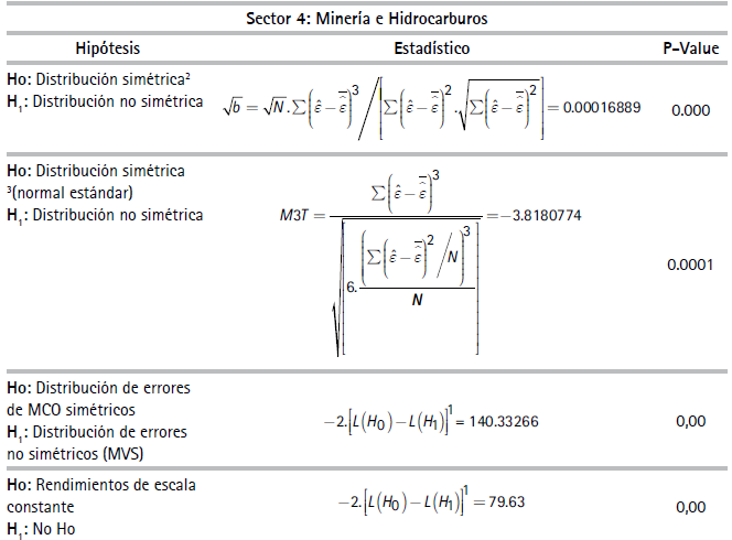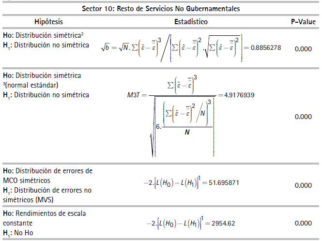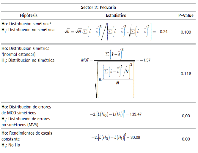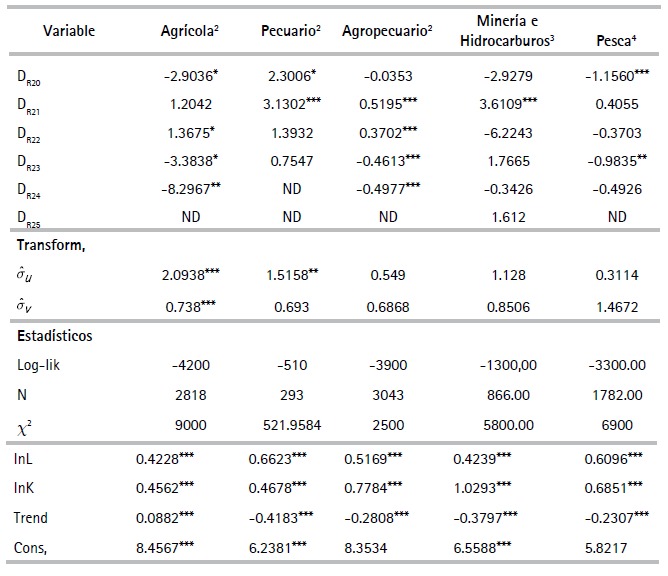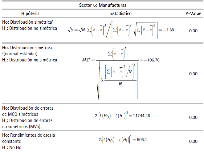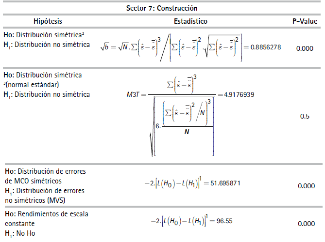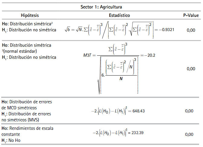 Por razones de espacio no se reportan los estadísticos descriptivos de las variables de unidades de producción usadas en las especificaciones del (3) al (6)27 En la muestra, la productividad laboral de las empresas del sector minero resultó ser la más alta y las empresas del sector agrícola, la más baja. El Cuadro 1 reporta resultados de las pruebas estadísticas realizadas las cuales corresponden a si las FP son determinísticas o estocásticas y si existen, o no, tecnologías con economías constantes a escala. El Cuadro 2 presenta coeficientes y estadísticos de ajuste de las regresiones correspondientes a las FPS de los diez sectores estimados con el método de máxima verosimilitud28 asumiendo la distribución de los errores de la función producción como normales y la distribución de los errores de los índices de eficiencia técnica como una distribución normal truncada29.