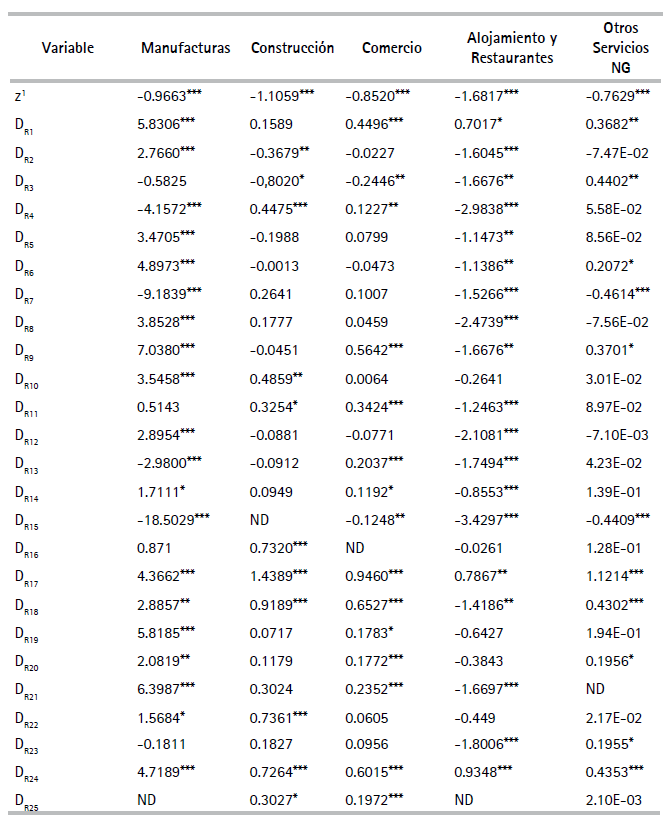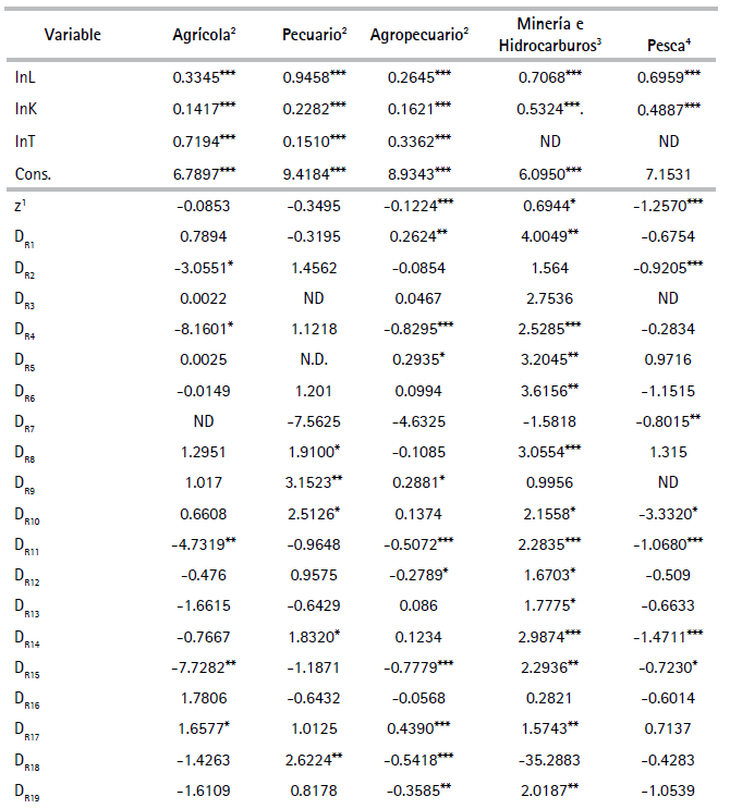 * Significativo al 10% ** Significativo al 5% *** Significativo al 1%. 1 La variable ‘z’ es el logaritmo del ingreso real per cápita distrital obtenido de PNUD (2013). Los coeficientes de variable de tiempo usado en las regresiones ha sido una variable de tendencia (respecto al año de la observación); excepto para: 2 Los sectores agrícolas, pecuario y agropecuario corresponden al año 2015; 3 Los coeficientes de las variables binarias de tiempo para minería son: -1.243*** (año 2008); -0.895*** (2009); -0.832*** (año 2010); -1.038 (año 2011)***; -0.857*** (año 2012); -1.112*** (año 2013); -1.067*** (año 2014)). 4 Los coeficientes de las variables binarias de tiempo para pesca son: 1.955*** (año 2007); 1.203*** (2008); 1.021*** (año 2009); 0.634 (año 2010)***; -0.548* (año 2011); 0.311 (año 2012); 0.06 (año 2013). ND: No disponible.