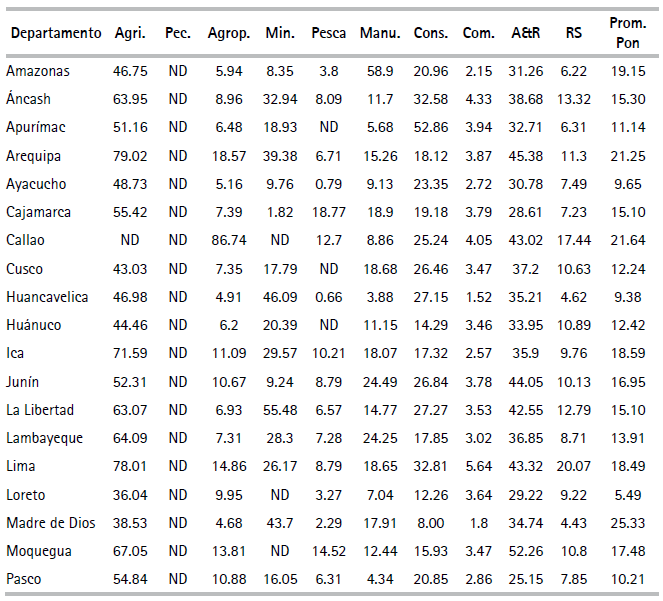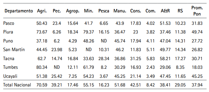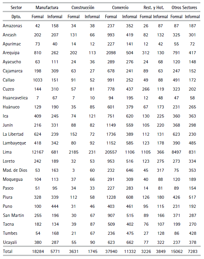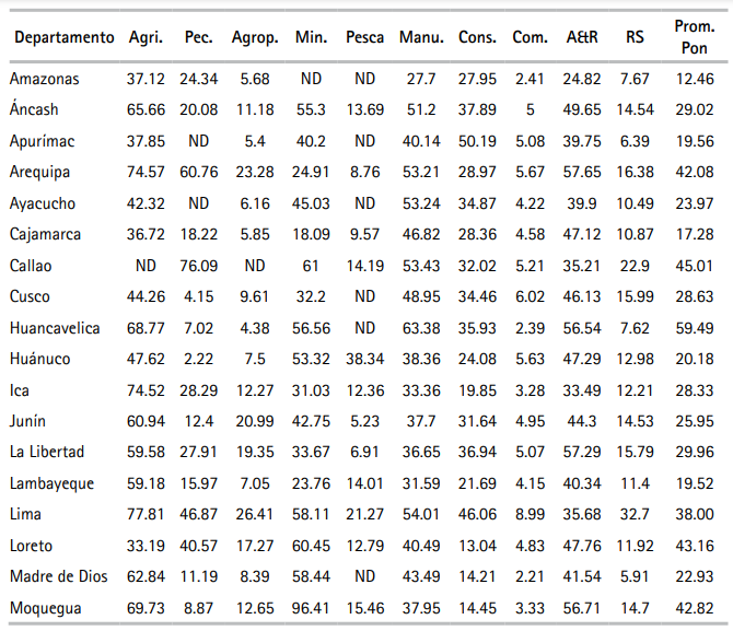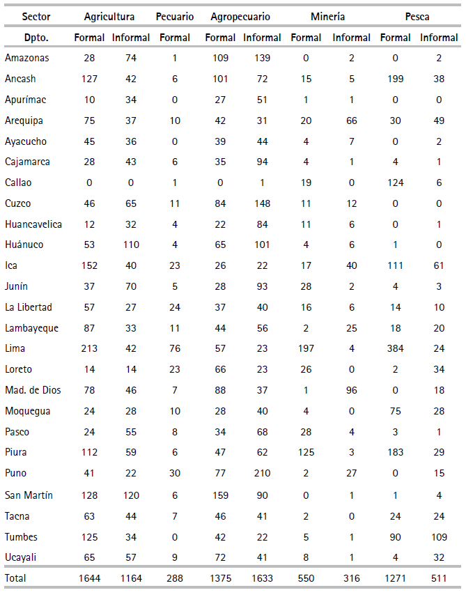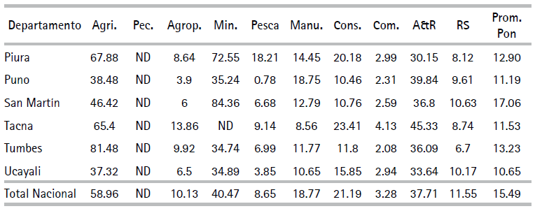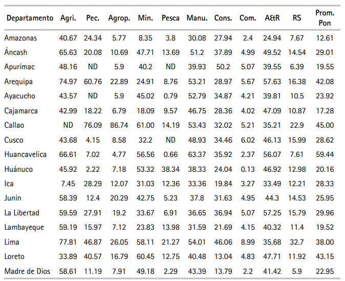 Paralelamente, las unidades productivas en las muestras con relativamente altos órdenes de magnitud de IET fueron aquellas de los sectores agrícola (moderno), minero, manufactura y construcción y los de menores valores fueron comercio, pesca, agropecuario, y servicios. Según el pronóstico, en general, para cada sector y/o departamento las unidades productivas informales fueron más ineficientes técnicamente que las formales. El IET general de las unidades informales es equivalente a 40.8% del respectivo promedio ponderado de las unidades productivas formales.