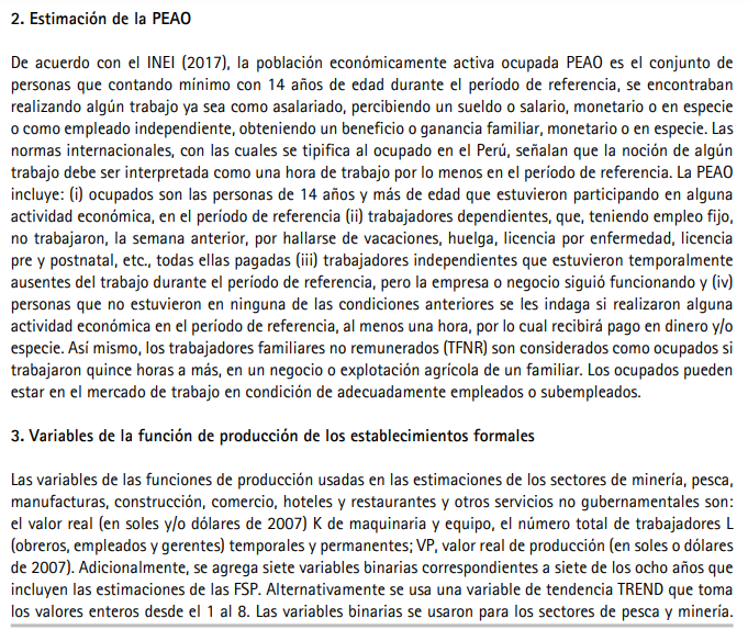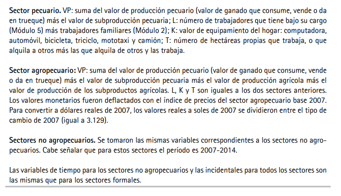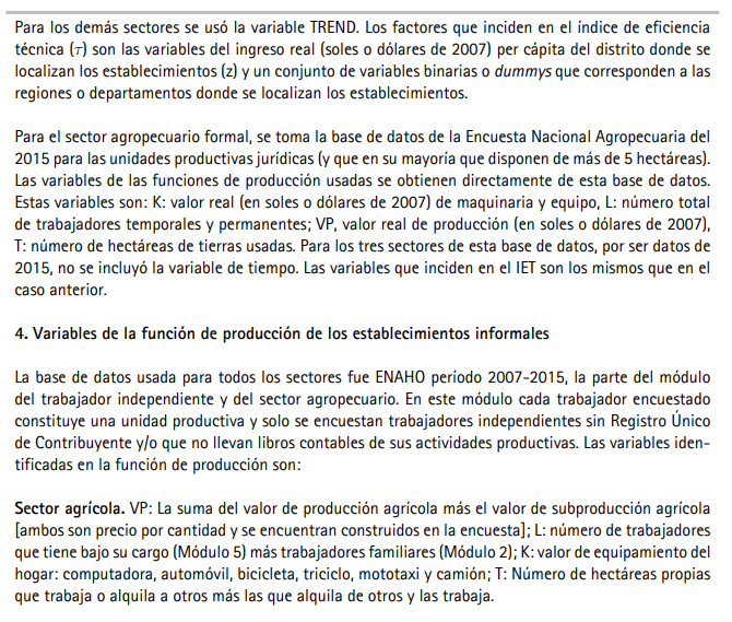 La lista de variables usadas en las tres especificaciones (3, 4, 5) para los diez sectores productivos es descrita en el Cuadro A3. Para las empresas formales, las variables de la FPS de los siete sectores no agropecuarios se obtienen de la Encuesta Económica Anual de los años 2008 a 2015 (INEI-EEA 2019), los cuales corresponden al período 2007-2014. Sujeta a potenciales errores de medición, la definición de las variables de la FPS es relativamente estándar en las encuestas de dichos sectores. Los deflactores usados para los valores reales de producción y capital de las unidades productivas (formales e informales) son los correspondientes de cada sector. Para las empresas agropecuarias formales (en general con disponibilidad de tierras mayor a cinco hectáreas), las variables se obtienen de la Encuesta Nacional Agraria 2016 (INEI-ENA 2016). Las diferencias en tiempo de las variables de los sectores agropecuario y no agropecuario implican que los estimados de los IET representan promedios solo de 2015 para los sectores agropecuario y promedios del período 2007-2014 para los sectores no agropecuarios.