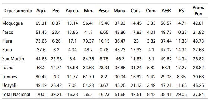 Los IET de la muestra de empresas del período del sector agrícola han tenido magnitudes (o niveles) mayores a las respectivas magnitudes de la muestra de empresas y período del sector manufacturero. La misma interpretación se puede realizar para el promedio ponderado de los IET de todas las empresas (formales e informales) consideradas en la muestra y períodos de los diez respectivos sectores. Así, para el promedio ponderado a nivel nacional, el orden de magnitud de las estimaciones de los IET —37.94— ha sido bajo, medido en a escala de 0 a 100. Por último, los IET de cada sector (columna) de los Cuadros 4 —empresas formales— y Cuadro 5 —unidades productivas informales— pueden ser comparados dado que provienen de las mismas especificaciones y regresiones de dicho sector (columna). Al igual que el caso de las regiones (filas) del Cuadro 3, los IET no son comparables, solo proveen información del orden de magnitud relativa a las muestras de empresas de cada sector (columna).