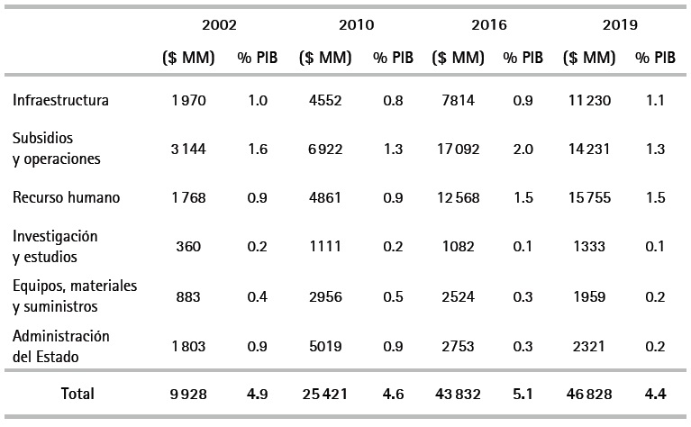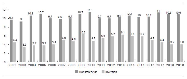 Las cifras analizadas indican una gran inflexibilidad del gasto público, especialmente en el rubro de transferencias. Este rubro representa en promedio para el periodo 2002-2019 el 38 % del PGN y está compuesto por una amplia gama de partidas, dentro de las cuales sobresalen las apropiaciones para el pago de pensiones y el Sistema General de Participaciones (SGP). Las demás partidas que componen las transferencias se encuentran respaldadas en su mayoría por la Constitución y la ley. En el caso de la inversión, que representa en promedio el 18 % del PGN, existen menos rigideces y en consecuencia el Gobierno tiene mayor autonomía para programar el gasto de acuerdo con la evolución de las finanzas públicas y la economía. No obstante, en los últimos años los recursos se han inflexibilizado por la utilización del mecanismo de las vigencias futuras y por los programas sociales que han venido trasladándose entre diferentes gobiernos. Cabe resaltar que la inversión no solo está integrada por proyectos de infraestructura, sino por asignaciones para subsidios, programas sociales y formación de capital humano. Las apropiaciones para infraestructura solo representan el 20 % del total del componente de inversión.