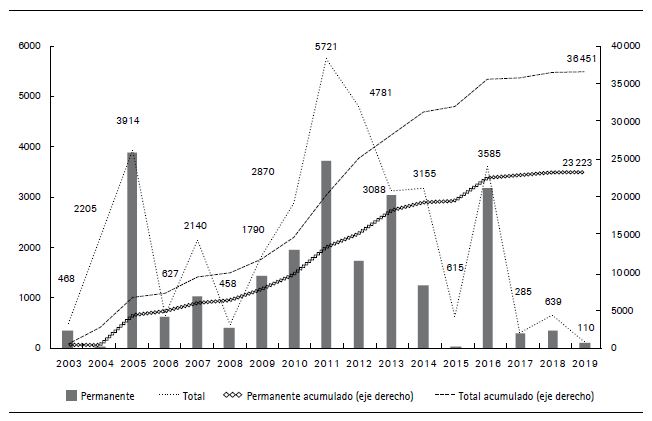 El costo fiscal anual de las leyes aprobadas en el periodo 2003-2019 (eje izquierdo), así como el costo acumulado de estas leyes (eje derecho), de acuerdo con las estimaciones del MHCP, se presenta en la Figura 2. Como allí se observa, el costo total acumulado de las leyes aprobadas en el periodo asciende a $ 36.5 billones (3.4 % del PIB), de los cuales $ 23.2 billones (2.2 % del PIB) tienen carácter permanente. Dado que el costo de algunas leyes no está cuantificado en los marcos fiscales, su impacto en las finanzas públicas está subestimado. No obstante, en el proceso de formulación del presupuesto estas obligaciones se deben incorporar, lo que genera mayor presión sobre el gasto público. Es importante destacar que para los años 2005, 2011, 2012 y 2016 se estiman los costos más altos de las leyes aprobadas durante el periodo. En estos cuatro años se acumula cerca de la mitad de los costos fiscales totales de las leyes sancionadas entre 2003 y 2019. Las leyes aprobadas en 2011 son las de mayor costo fiscal, con un valor estimado de $ 5.7 billones. Dentro de estas normas se puede destacar la Ley 1438, que reforma el Sistema General de Seguridad Social en Salud, al unificar el Plan Obligatorio de Salud (POS) del régimen subsidiado y del contributivo para todos los residentes del país, con un costo estimado por la Dirección General del Presupuesto Público Nacional de $ 1.3 billones. También se puede destacar la Ley 1448 sobre reparación de víctimas, que fijó medidas sobre la atención, asistencia y reparación integral a las víctimas del conflicto armado interno, por hechos ocurridos a partir de enero de 1985, con un costo de $ 1.3 billones. Además, sobresale la Ley 1432, que crea el Sistema Nacional de Vivienda de Interés Social, establece el subsidio familiar de vivienda y reforma el Instituto de Crédito Territorial, y tiene un costo estimado de $ 0.8 billones.