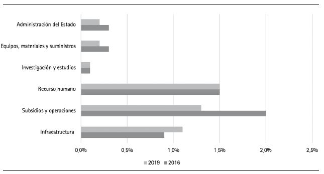 De conformidad con la información del DNP, las apropiaciones para subsidios, formación del recurso humano e infraestructura constituyen los componentes más importantes del presupuesto inicial de inversión, como se observa en el Figura 3 y el Cuadro 717. En el año 2019 las apropiaciones para subsidios alcanzaron 1.3 % del PIB, las de formación de recurso humano 1.5 % del PIB y las de infraestructura 1.1 % del PIB. Frente a 2016, se advierte una reducción en las apropiaciones por subsidios, como consecuencia de la reclasificación de los aportes al régimen subsidiado de salud que se trasladaron al presupuesto de funcionamiento. También se observa un ligero aumento en las apropiaciones para infraestructura, por la asignación de mayores recursos al Invías y por el establecimiento de un Fondo Único de Tecnologías de la Información y las Comunicaciones.
