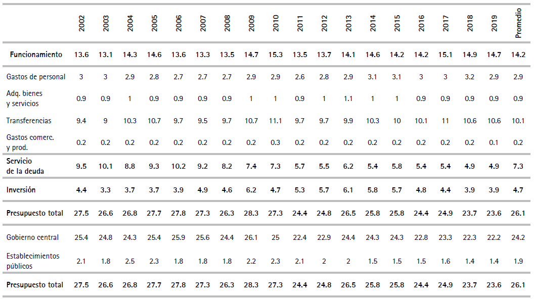 Entre 2002 y 2019 las apropiaciones del PGN se ubicaron en promedio en 26.1 % del PIB, de los cuales el 24.2 % del PIB se atendió con rentas nacionales y el 1.9 % del PIB con recursos propios de los establecimientos públicos. Durante este periodo, el funcionamiento constituyó el principal rubro de gasto con un promedio de 14.2 % del PIB. Al interior de esta partida, los gastos de personal explican en promedio 2.9 % del PIB, los gastos generales 0.9 % del PIB y las transferencias 10.1 % del PIB. Dentro del componente de funcionamiento, el rubro más importante es el de transferencias, que ascendió de 9.4 % del PIB en 2002 a 11.1 % del PIB en 2010, para ubicarse en 10.6 % en 2019 (Figura 1 y Cuadro 1).