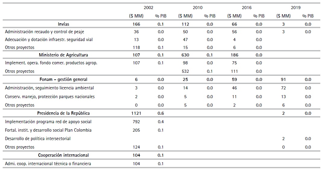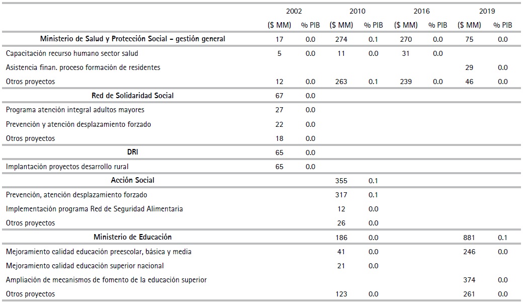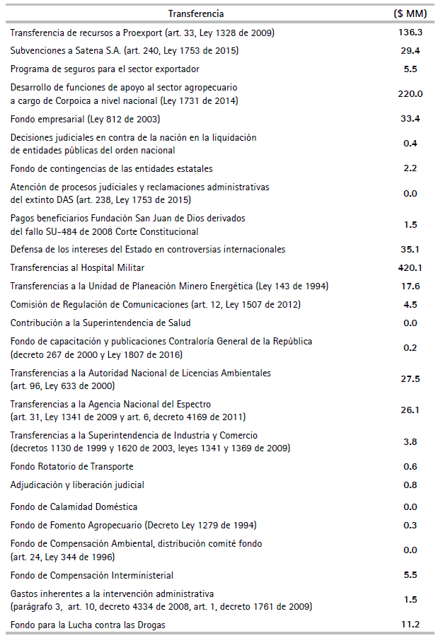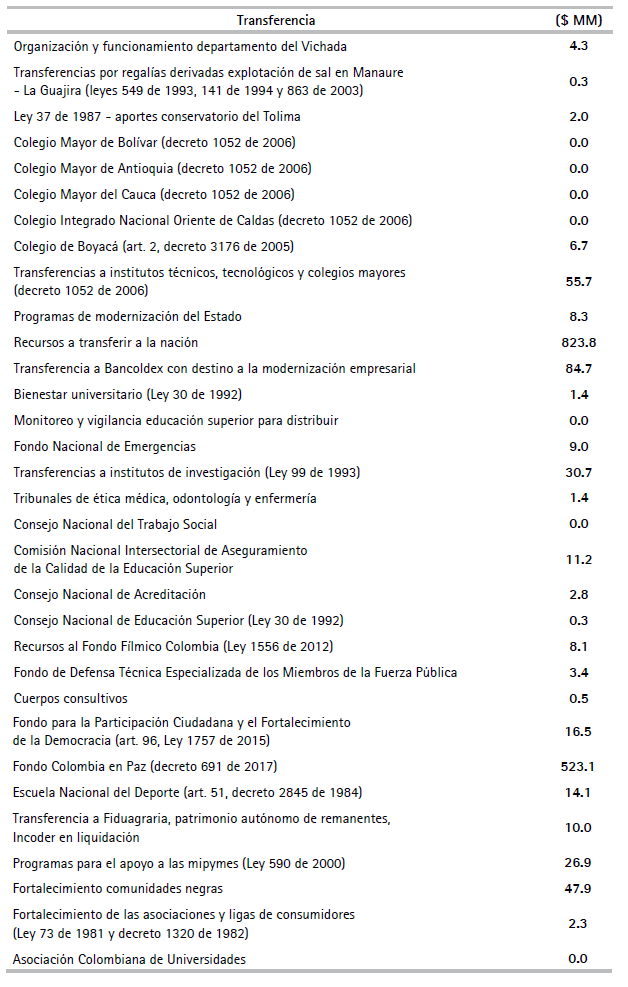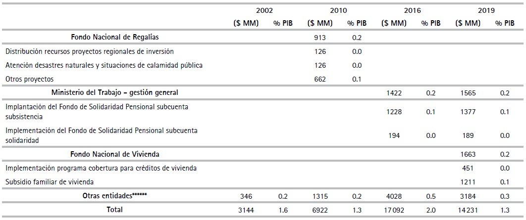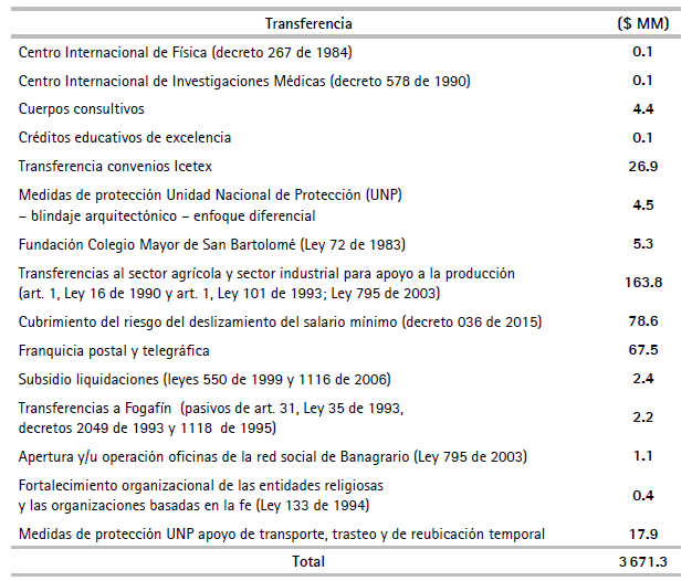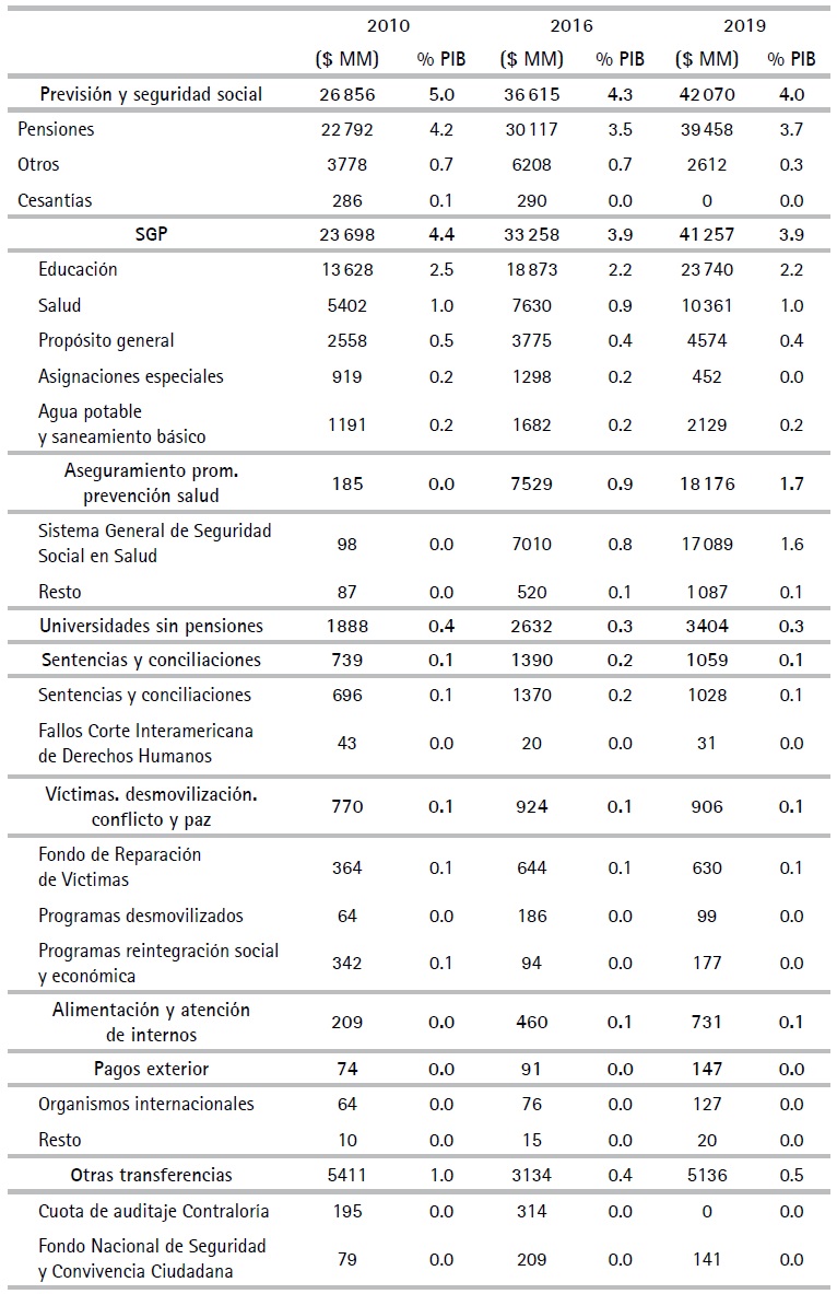 Por último, en el Cuadro 3 se presenta bajo una partida denominada “resto” de “otras transferencias” un monto de gasto que en 2019 alcanza 0.4 % del PIB. En este grupo de partidas de gasto se registra una serie de obligaciones del Gobierno con diferente propósito, entre las cuales se encuentran partidas con respaldo legal o incluidas por decreto y algunas sin asignar para la distribución previo concepto de la Dirección General del Presupuesto Público Nacional. Dentro de estos rubros están las transferencias de los excedentes financieros de los establecimientos públicos a la nación, las transferencias del Gobierno al Hospital Militar Central, los apoyos para el sector agropecuario y la industria, algunas transferencias para el Instituto Colombiano de Crédito Educativo y Estudios Técnicos en el Exterior (Icetex), las subvenciones a Satena y los apoyos al Colegio Boyacá, al Colegio Mayor de San Bartolomé y a algunos institutos técnicos y tecnológicos. Para una lista completa de estas partidas y sus respectivos montos, véase el Anexo de este documento.