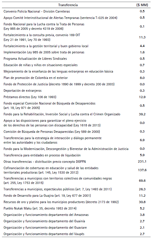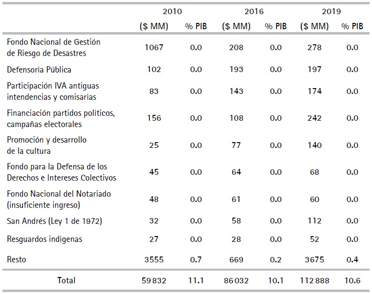 En el rubro de transferencias del PGN también se incluye una gama amplia de otras transferencias con menor valor, que en la mayoría de los casos tienen respaldo legal y alcanzan $ 5.1 billones (0.5 % del PIB) en 2019, como se muestra en el Cuadro 3. Dentro de estas partidas se encuentran las transferencias realizadas al Fondo Nacional de Seguridad y Convivencia Ciudadana, que funciona como una cuenta especial administrada por el Ministerio del Interior, y al Fondo Nacional de Gestión de Riesgo de Desastres, que atiende las necesidades originadas en situaciones de desastre o calamidad. También se destacan los recursos para la Defensoría del Pueblo, el Fondo para la Defensa de los Derechos e Intereses Colectivos y el Fondo Nacional del Notariado, así como las transferencias por participación en el IVA de las antiguas intendencias y comisarías, la financiación de partidos y campañas electorales y la promoción y desarrollo de la cultura. Igualmente se destacan las transferencias para San Andrés y Providencia establecidas en la Ley 1 de 1972 y las transferencias de recursos a los municipios con resguardos indígenas, definidas en las leyes 44 de 1990 y 223 de 1995.