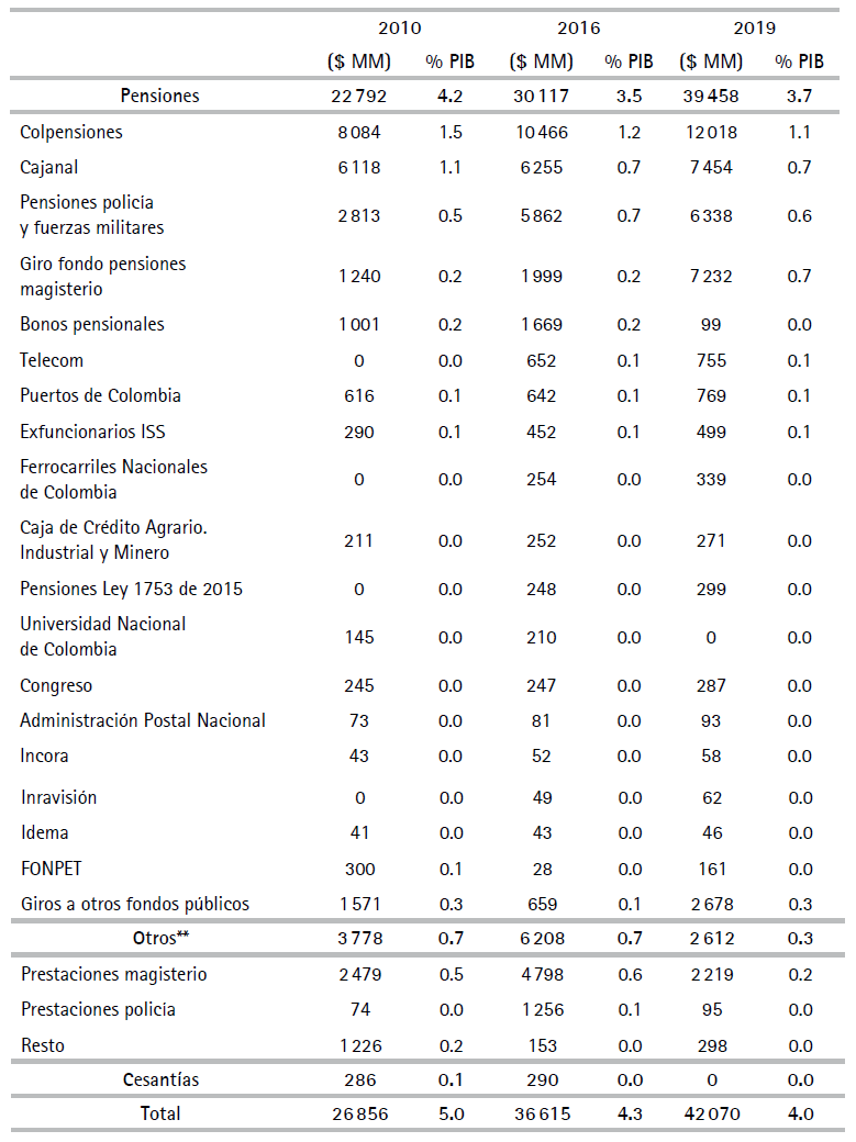 ** La información de Otros incluye prestaciones sociales que no son pensiones, y otras partidas como auxilios funerarios, indemnizaciones, auxilios sindicales, programas de créditos de vivienda, programas de salud ocupacional, incapacidades y licencias de maternidad, entre otros.