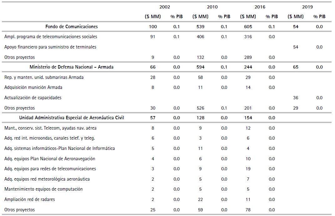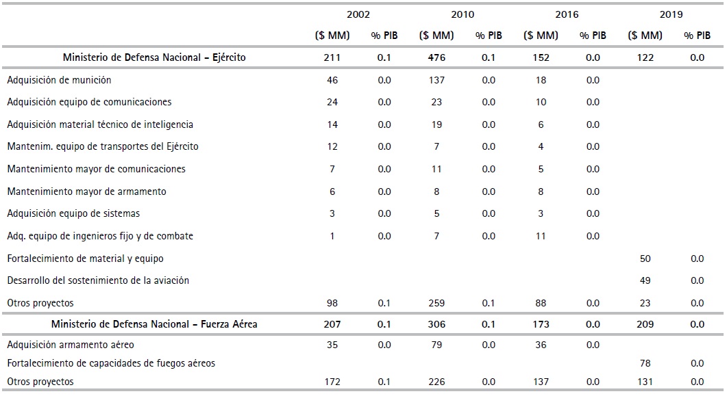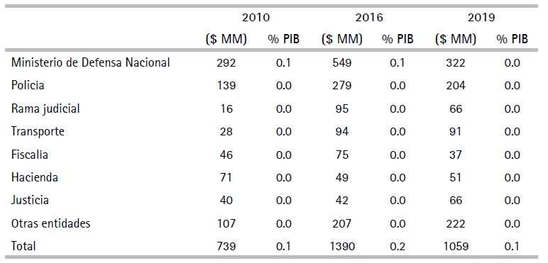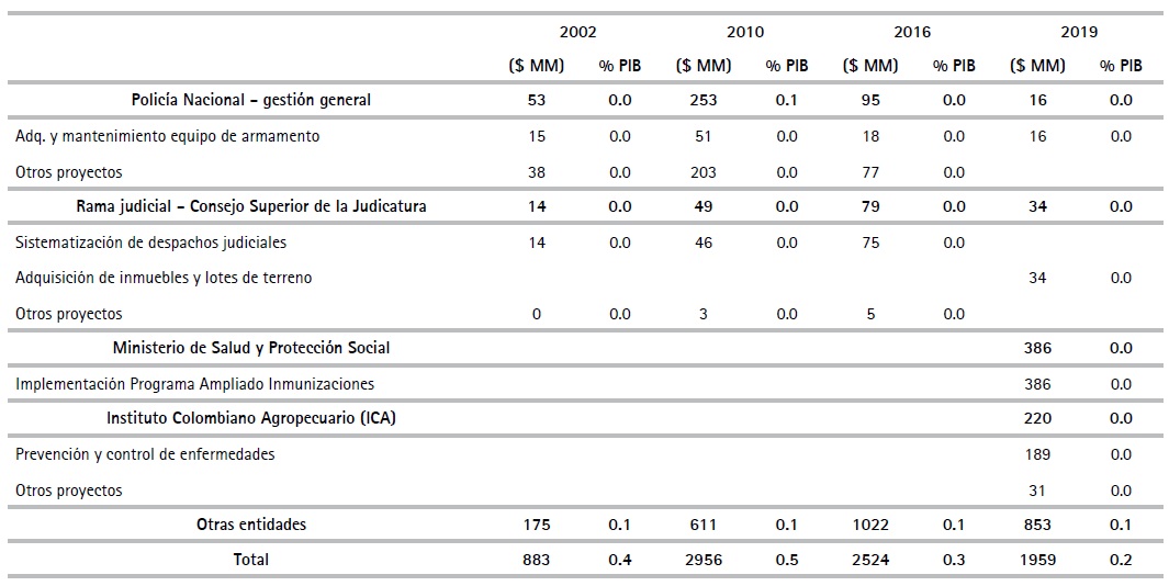 Con respecto a la dotación de equipos y a la compra de materiales y suministros, se apropiaron $ 2 billones (0.2 % del PIB) en 2019 (Cuadro 12). Estos recursos se consagraron al fortalecimiento y adquisición de materiales y equipos por parte del Ministerio de Defensa Nacional (para el ejército, la fuerza aérea y la armada), para el programa de inmunizaciones del Ministerio de Salud y Protección Social y para diversos proyectos del Instituto Colombiano Agropecuario (ICA).