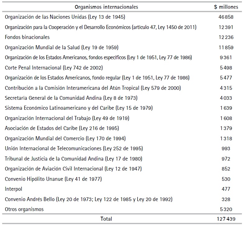 Fuente: MHCP.Las transferencias por pagos de sentencias y conciliaciones contabilizan 0.1 % del PIB en 2019 y se concentran en fallos contra el Ministerio de Defensa Nacional y la Policía Nacional (Cuadro 5). En el rubro de transferencias además se incluyen los programas para víctimas y desmovilizados del conflicto armado por 0.1 % del PIB, la alimentación y atención para la población carcelaria por 0.1 % del PIB y los aportes a organismos internacionales, que se dirigen principalmente a la Organización de las Naciones Unidas (Ley 13 de 1945), la OCDE (Ley 1450 de 2011), algunos fondos binacionales, la Organización Mundial de la Salud (Ley 19 de 1959), la Organización de los Estados Americanos (Ley 1 de 1951, Ley 77 de 1986), la Corte Penal Internacional (Ley 742 de 2002), la Secretaría General de la Comunidad Andina (Ley 8 de 1973), el Sistema Económico Latinoamericano (Ley 15 de 1979), la Organización Internacional del Trabajo (Ley 49 de 1919), la Organización Mundial del Comercio (Ley 170 de 1994), la Unión Internacional de Telecomunicaciones (Ley 252 de 1995), el Tribunal de Justicia de la Comunidad Andina (Ley 17 de 1980), la Organización Internacional de Policía Criminal (Interpol) y el Convenio Andrés Bello (Ley 20 de 1973, Ley 122 de 1985 y Ley 20 de 1992) (Cuadro 6).
