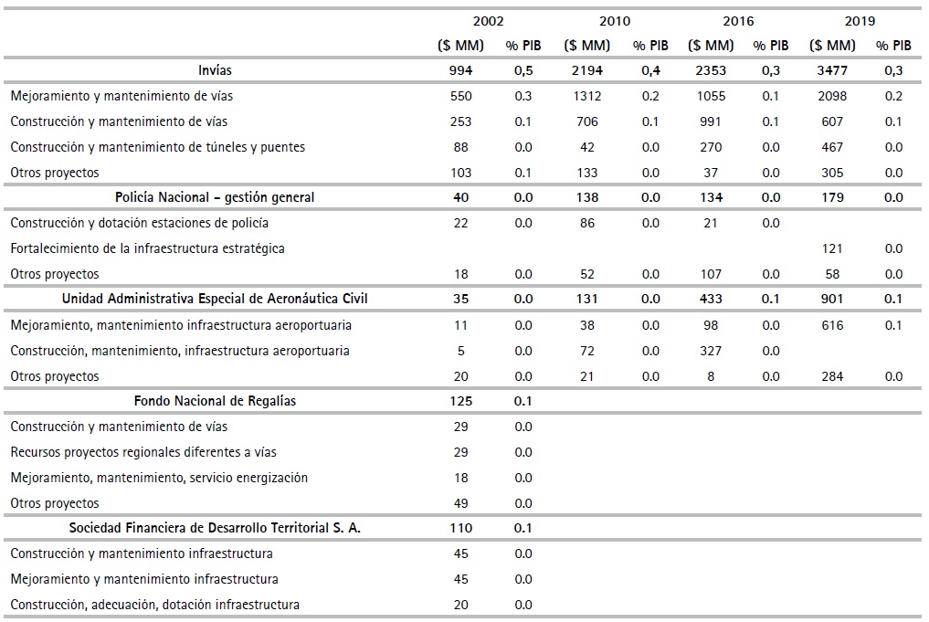 El presupuesto para infraestructura incluye proyectos dirigidos a la construcción, mantenimiento y mejoramiento de carreteras, puentes, túneles, vías férreas, infraestructura aeroportuaria y otras obras civiles. Las entidades encargadas de administrar estos proyectos se presentan en el Cuadro 8, junto con los principales proyectos que ellas adelantan. Como allí se muestra, el mayor presupuesto lo administra el Invías, responsable de los programas y proyectos de infraestructura de la red vial, férrea, fluvial y marítima y la ANI, que se ocupa de coordinar y administrar las concesiones y otros proyectos de asociación público-privada. Estas dos entidades explican el 52.5 % de la inversión en infraestructura en el año 2019. El 47.5 % restante lo administra la Aeronáutica Civil, la Policía Nacional, el Fondo Único de Tecnologías de la Información y las Comunicaciones y otro tipo de entidades.