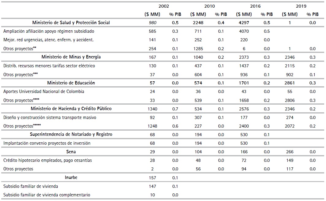 ** En el año 2010, la apropiación de recursos para el Fondo de Solidaridad Pensional se incluye en este Ministerio debido a que en este año los ministerios de Salud y del Trabajo estaban fusionados. En el 2016 y 2019, esta partida se incluye en el Ministerio del Trabajo.