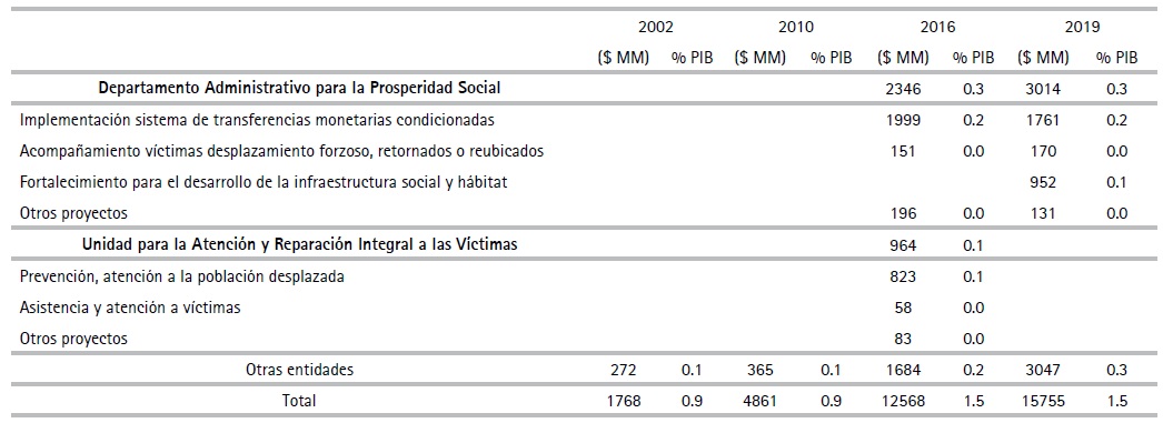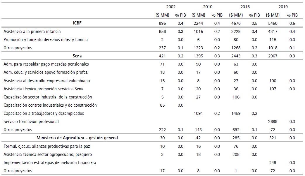 Con relación a las apropiaciones a favor del recurso humano, en 2019 se asignaron $ 15.6 billones, que representan 1.5 % de PIB (Cuadro 10). Estos recursos se concentran en los aportes al ICBF, por $ 5.5 billones (0.5 % del PIB), al Sena, por $ 3 billones (0.3 % del PIB) y al Departamento Administrativo para la Prosperidad Social (DPS), por $ 3 billones (0.3 % del PIB). El ICBF asigna los recursos a programas de asistencia a la primera infancia y a la promoción y fomento para la construcción de una cultura de los derechos de la niñez y la familia. El Sena destina la mayor parte de los recursos a programas de formación profesional y el DPS a programas de transferencias monetarias condicionadas como Familias y Jóvenes en Acción.