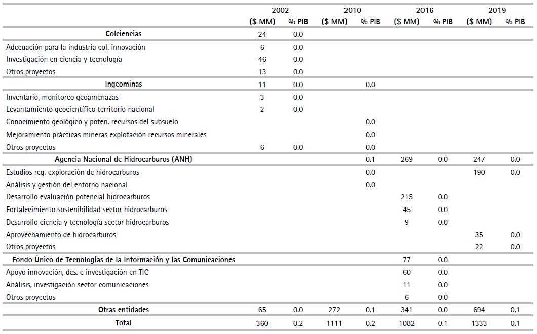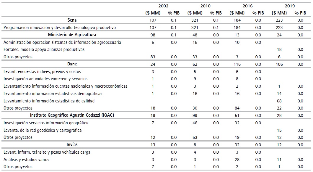 Las apropiaciones para investigación y estudios alcanzaron $ 1.3 billones (0.1 % del PIB) en 2019 (Cuadro 11). Estos recursos se asignaron principalmente a la financiación de programas de innovación y desarrollo tecnológico y productivo en cabeza del Sena, al levantamiento de estadísticas del Departamento Administrativo Nacional de Estadística y a estudios regionales para la exploración de hidrocarburos por parte de la ANH.