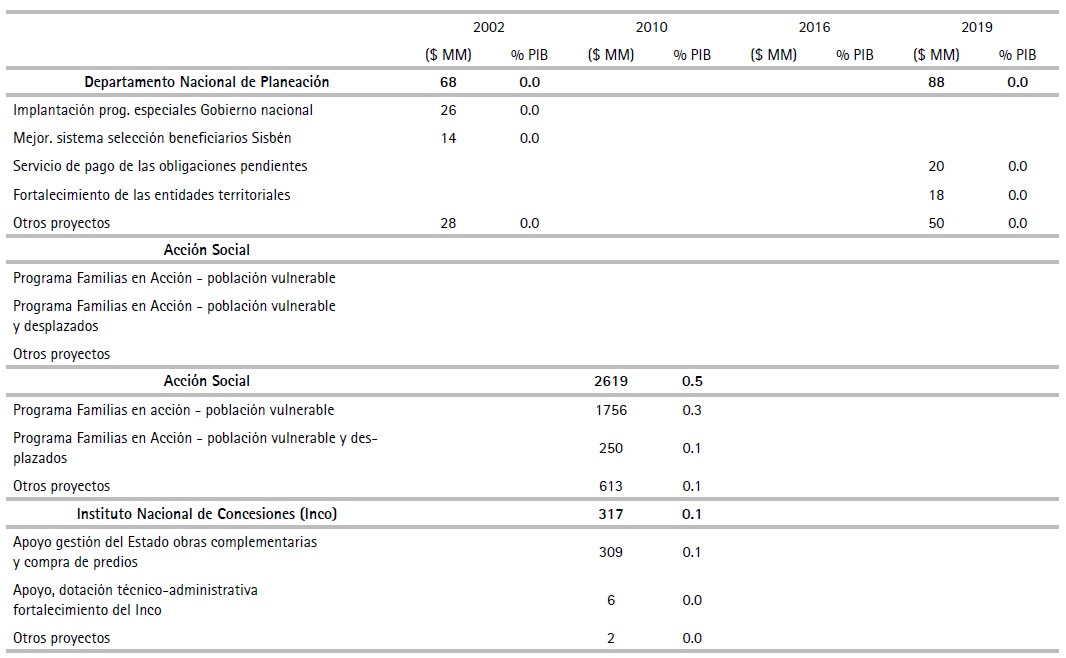 En las siguientes subsecciones se presenta una descripción de las leyes aprobadas y su costo fiscal en el periodo 2003-2019 y luego se analiza en detalle los rubros que integran el presupuesto de transferencias (años 2010, 2016 y 2019) e inversión (2002, 2010, 2016 y 2019) con el fin de dimensionar y precisar el tipo de partidas, programas y proyectos que se incluyen en estos componentes. Las partidas del rubro de transferencias generalmente están respaldadas en la Constitución o en la ley, por lo que se caracterizan por su inflexibilidad y poco dinamismo en el tiempo. Las partidas de inversión, por el contrario, reflejan una mayor autonomía del Gobierno en el proceso de formulación presupuestal, pero como ya se señaló, en los últimos años vienen adquiriendo algún grado de rigidez debido a la inclusión de las vigencias futuras y a los compromisos políticos ligados a diversos programas sociales, como el de Familias y Jóvenes en Acción, entre otros.
