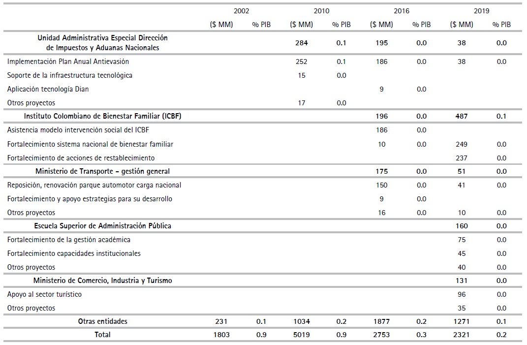 Finalmente, los recursos destinados a la administración del Estado alcanzaron $ 2.3 billones (0.2 % del PIB) en 2019 (Cuadro 13). Estos recursos se dedican a la ejecución de acciones y programas dirigidos a mejorar la gestión gubernamental. Dentro de estos programas se pueden destacar la evaluación de licencias ambientales y la protección de parques nacionales en cabeza del Fondo Nacional Ambiental, el fortalecimiento de las entidades territoriales y otros proyectos a cargo del DNP, la consolidación de los sistemas del ICBF, el afianzamiento de la gestión académica y capacidades institucionales de la ESAP y el fortalecimiento del sistema de atención al ciudadano a cargo del Ministerio de Industria y Comercio.