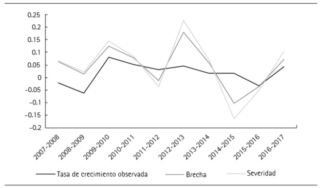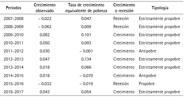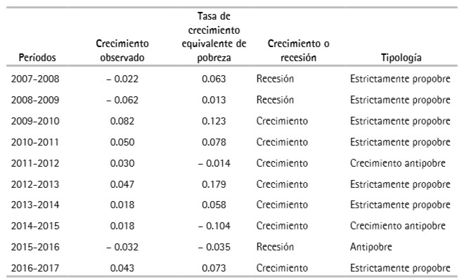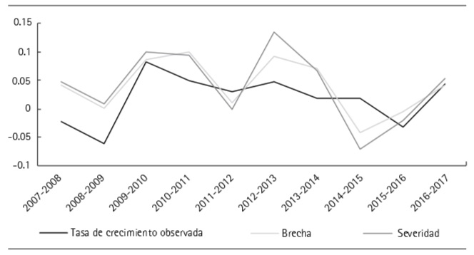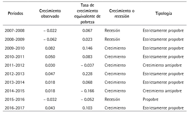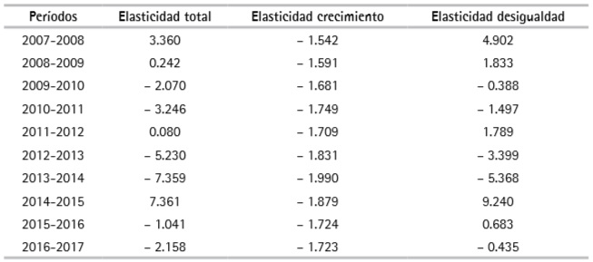 En los primeros períodos la tasa de crecimiento observada es negativa, esto es, el crecimiento medio de los ingresos per cápita reales ha disminuido (recesión), sin embargo, los valores correspondientes a la PEGR (brecha y severidad) han sido positivos, lo que se puede evidenciar en la Figura 2, donde se observa que los períodos de recesión (2007-2008; 2008-2009) han estado acompañados de una reducción de la desigualdad, es decir, en términos absolutos, la elasticidad de la pobreza con respecto a la desigualdad fue mayor a la elasticidad de la pobreza con respecto al crecimiento, generándose en estos dos primeros períodos un crecimiento estrictamente propobre; los demás períodos, a excepción del correspondiente a 2015-2016, han tenido escenarios de crecimiento, en donde se encuentra que en los períodos 2009-2010 y 2010-2011 ha existido un crecimiento estrictamente propobre, que indica que el crecimiento ha venido acompañado de una reducción en la desigualdad, fenómeno que no se cumple para los períodos 2011-2012 y 2016-2017, donde se nota un crecimiento por goteo (trickle down), en el que la pobreza se ha visto reducida pero acompañada de un aumento en la desigualdad; finalmente, para el período 2014-2015 el crecimiento es antipobre, esto es, el crecimiento económico ha venido acompañado de un incremento de la desigualdad más grande, lo que contrarresta el efecto del crecimiento11.