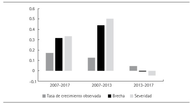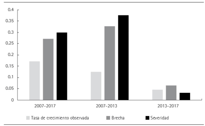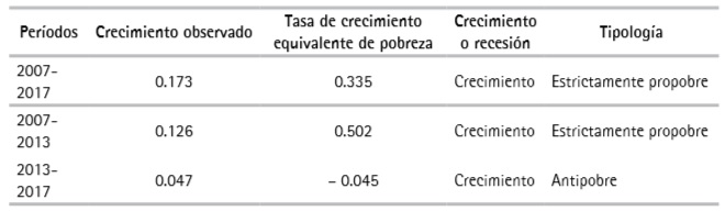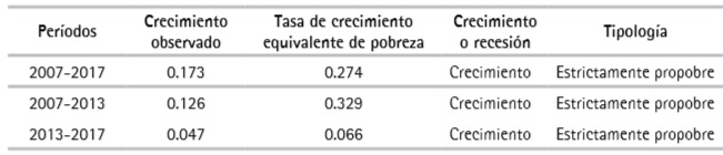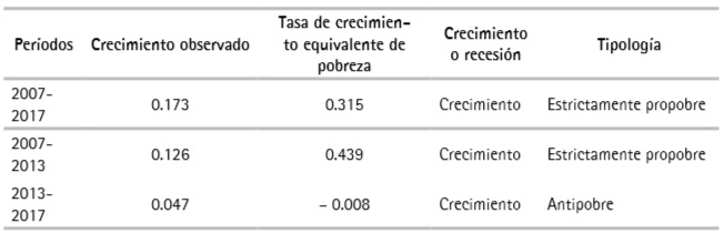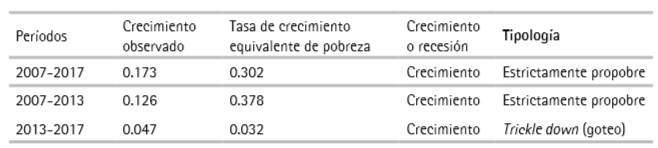 Al realizar el análisis para el período total (2007-2017) y para los dos períodos presidenciales (2007-2013 y 2013-2017), el crecimiento que se presenta es estrictamente propobre a excepción del segundo período presidencial, debido a que la PEGR enfocada en la severidad demuestra un crecimiento por goteo, es decir, las personas pobres ubicadas lejos de la línea de pobreza no se han beneficiado de la misma manera que las que se han ubicado cerca.