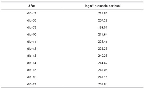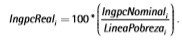 Para el estudio, Kakwani y Son (2004) proponen el uso del ingreso per cápita real como el indicador monetario de bienestar, por tanto, al contar con el ingreso per cápita nominal sugieren que este indicador se construya de acuerdo con la línea de pobreza nominal correspondiente para cada año, lo que implica deflactar el ingreso per cápita, debido a que la línea de pobreza de cada año capta incrementos en los precios8.