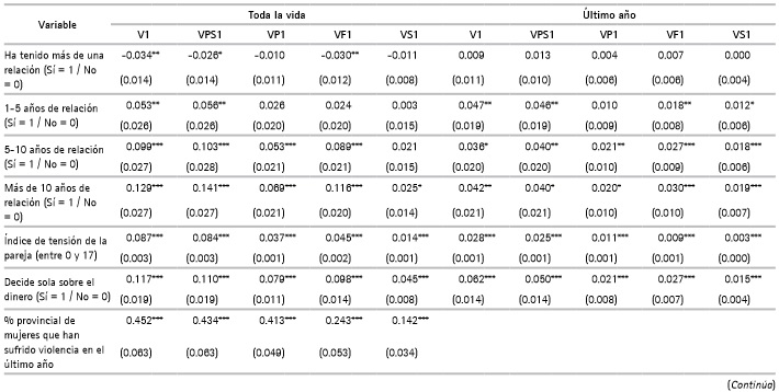 En el caso de la tolerancia a la violencia por parte de la mujer se observa que esta se relaciona con un mayor riesgo de sufrir violencia en la pareja. De forma similar, se encuentra un nexo entre los factores asociados a los roles de género tradicionales y la violencia en todos sus tipos, teniendo que las mujeres que cuentan con un trabajo fuera del hogar y quienes tienen mayor número de hijos presentan mayor probabilidad de sufrir violencia, lo que constituye un aporte a la literatura actual que establece resultados inconsistentes sobre estos factores.