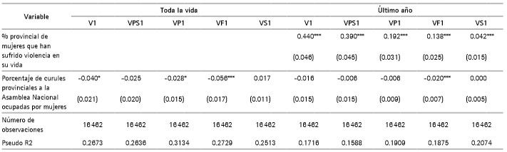 De acuerdo con el modelo propuesto, la mayor representación política de las mujeres se relaciona, principalmente, con una menor probabilidad de sufrir violencia física. Este resultado puede interpretarse desde una mayor conciencia de la violencia física, como el tipo más visible por los efectos que esta genera en las provincias con mayor representación política femenina.