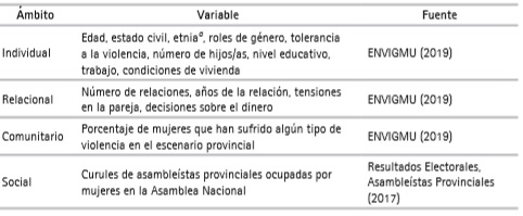 Con el propósito de identificar los factores de riesgo de diferentes tipos de violencia de género en la pareja en el Ecuador se utiliza la segunda ENVIGMU de 2019, y se construyen variables propias para los ámbitos individual, relacional y comunitario. La encuesta la ejecutó el INEC mediante un muestreo probabilístico y se levantó entre julio y agosto de 2019, a mujeres de 15 años en adelante, tanto del área urbana como rural, en todo el país, con una muestra de 20 848 viviendas (INEC, 2019b). La base cuenta con 17 211 observaciones, de las que se excluye 749 observaciones que corresponden a mujeres que no han tenido pareja, dejando un total de 16 462 observaciones que representan a 5 853 420 mujeres. Adicionalmente, se utiliza la información del Consejo Nacional Electoral sobre la participación de mujeres en la Asamblea Nacional como elemento del nivel social.