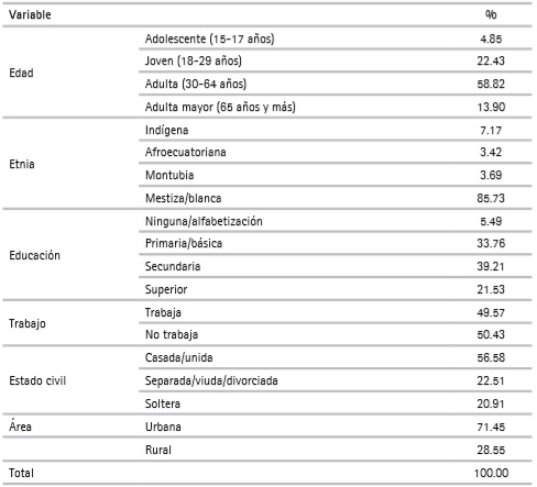 En el Cuadro 2 se observa que más de la mitad de las mujeres son adultas (58.82 %), seguidas de jóvenes (22.43 %), adultas mayores (13.90 %) y en menor porcentaje adolescentes (4.85 %). Con relación a su autoidentificación étnica, la mayoría corresponde a mujeres blancas/mestizas (85.73 %), seguidas de indígenas (7.17 %), montubias (3.69 %) y afroecuatorianas (3.42 %). En cuanto a nivel educativo hay una concentración en nivel secundario (39.21 %) y primario (33.76 %), seguido de nivel superior (21.53 %).