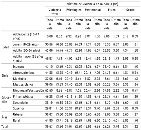 La encuesta refleja una mayor incidencia de violencia de género en mujeres adultas y adultas mayores a lo largo de toda la vida (Cuadro 3). Esta relación cambia cuando se observa la violencia sufrida en el último año, en cuyo caso son las jóvenes las que registran mayor prevalencia de violencia. Las mujeres indígenas reportan más violencia en la pareja a lo largo de toda la vida (47.10 %), seguidas de las afroecuatorianas (44.88 %), blancas/mestizas (39.05 %) y montubias (32.06 %). La violencia psicológica y física tienen mayor prevalencia en las mujeres indígenas, mientras que la violencia patrimonial y sexual son mayores en las mujeres afroecuatorianas. Respecto a la educación se observa que la prevalencia de violencia se reduce a medida que se alcanza un mayor nivel educativo. En el área rural se reporta más violencia psicológica y física que en el área urbana, mientras que en el área urbana la prevalencia de violencia patrimonial y sexual es mayor (Cuadro 3).