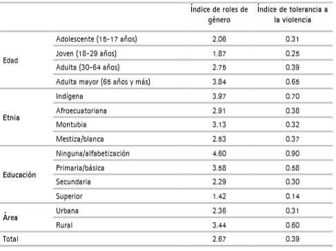 La tolerancia a la violencia de género se establece mediante un índice que presenta un valor promedio de 0.39 sobre 66. Respecto al índice de los roles de género, existe una débil aceptación de los roles femeninos y masculinos tradicionales, teniendo un promedio de 2.67 sobre 97. Entre los grupos de edad, las mujeres adultas y adultas mayores presentan índices promedio más elevados en dos índices. Las mujeres indígenas seguidas de las montubias presentan un mayor índice de aceptación de roles de género, mientras que las mujeres indígenas advierten una mayor tolerancia a la violencia de género. Las mujeres con menor educación formal tienen índices promedios más elevados de roles y tolerancia que van disminuyendo a medida que aumenta el nivel educativo. Por su parte, las mujeres en el sector rural reportan mayor aceptación de los roles de género y tolerancia a la violencia (Cuadro 4).